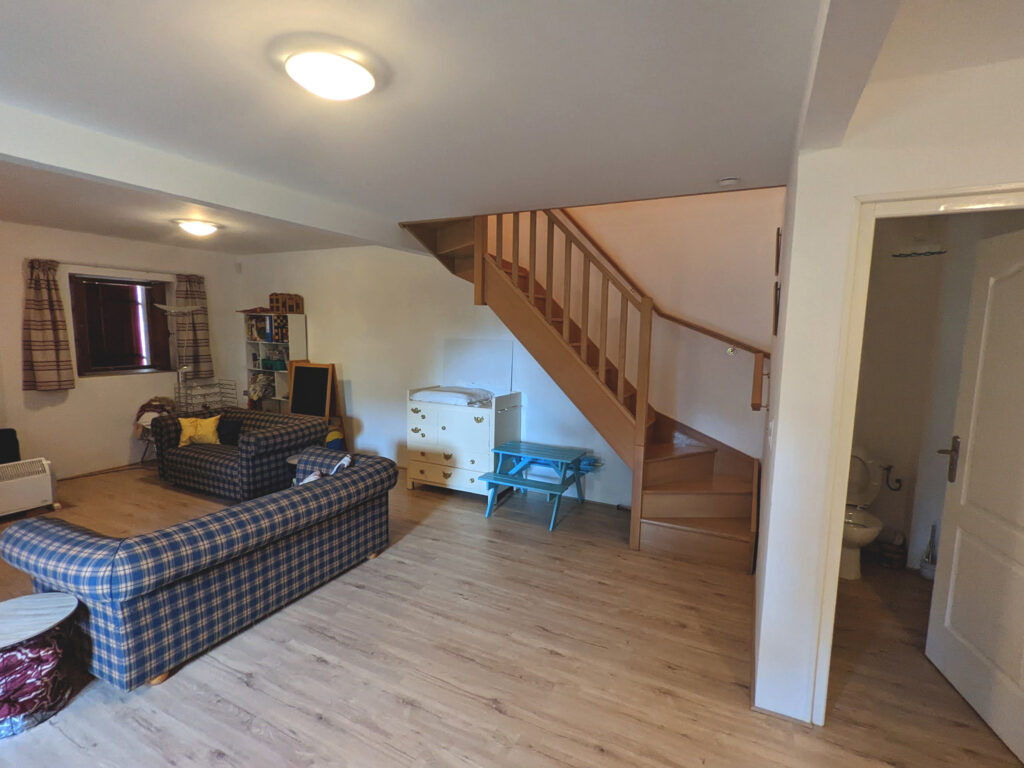 Het tweede woonhuis van 120 m² is gebouwd in 2016 en voorzien van een houtkachel, daarnaast zijn er aansluitpunten voor elektrische radiatoren. U stapt binnen in de ruime woonkamer met moderne, open keuken. Daarnaast zijn er een badkamer en apart toilet. Op de bovenverdieping bevinden zich drie slaapkamers en nog een apart toilet. Voor het huis ligt een grindterras uit het zicht van de boerderij.